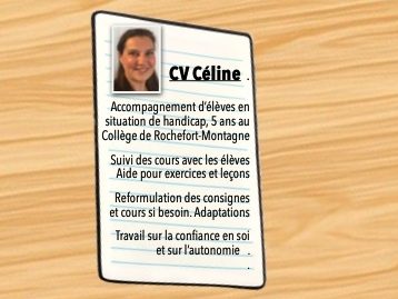 J'ai été AESH, Accompagnante d'Elèves en Situation de Handicap, pendant 5 ans au Collège de Rochefort-Montagne principalement. J'accompagnais les élèves en cours, les aidais à prendre des notes, j'étais un soutien dans la compréhension, un relai entre les professeurs et les élèves. Je reformulais les consignes, les leçons ou les exercices, les aidais à faire les devoirs, mais toujours avec comme point de mire, l’apprentissage de l’autonomie. Il ne s’agit pas de faire les devoirs à leur place, mais d’assister les élèves dans leur scolarité. Entre les années 2020/2021 et 2024/2025, j'ai accompagné huit élèves (MultiDys, TDA, TDAH...) de la 6ème à la 3ème.